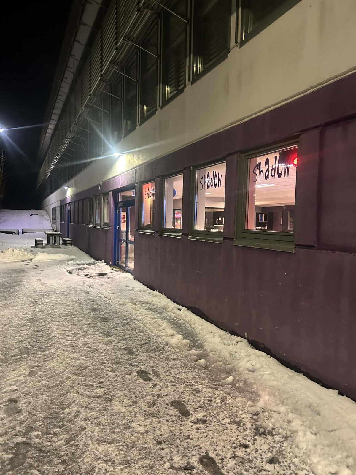 Det står ei bålpanne med benk på utsiden av bua med benker rundt.