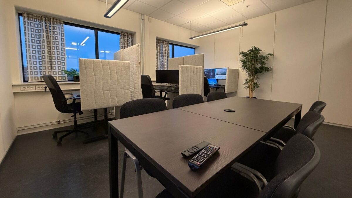 Gründerparken inneheld også eit møtebord med plass til seks personar. Det er kopla til fullt videokonferanseutstyr.